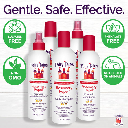 Trío de recambio de champú, acondicionador y spray acondicionador Fairy Tales Rosemary Repel Daily Kids: a los niños les gusta el olor, a los piojos no.