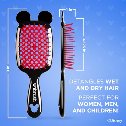 Details: UNbrush® - Mickey Mouse gently yet thoroughly extracts knots and tangles from even the most unruly hair, painlessly and effortlessly. Featuring the perfect blend of 105 dual length bristles, combined with an ultralight high performance handle, UNbrush® helps reduce styling time and prevents hair from catching. Great for wet or dry hair.